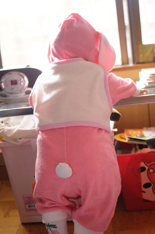 最近、這う直前まで行く娘。 だいぶ後ろ足でお尻が上がる様になりました。 そしてテーブルに捕まらせると数歩、歩いたりします。 今朝はウサギのつなぎ。帽子に顔のパーツ。 お尻には可愛いしっぽ付き。